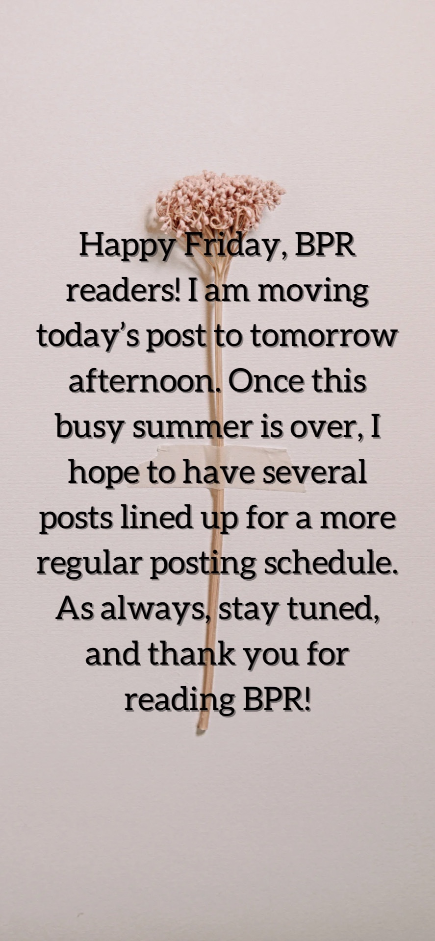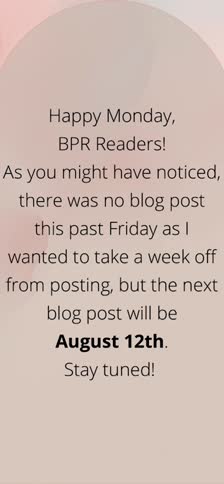 Happy Friday, BPR readers! Today I just have a brief announcement about the post schedule for you all. I am moving the post schedule back by a week because the next few blog posts will fall during weeks that I will be involved in church events. So, the next post will be next Friday the 20th, and posts will be every other Friday after that as usual.
